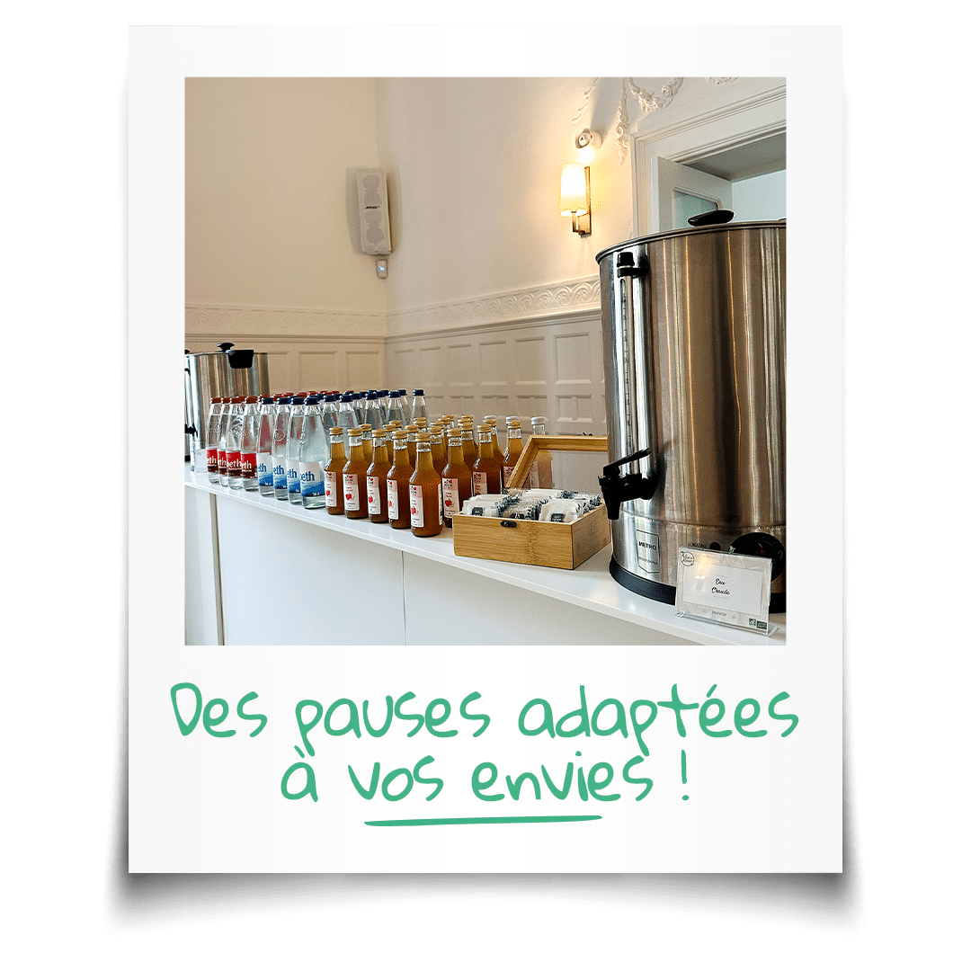 • Nous nous adaptons à vos besoins (collation sucrée/salée, boissons chaudes ou fraîches…) pour une journée idéale du début à la fin.